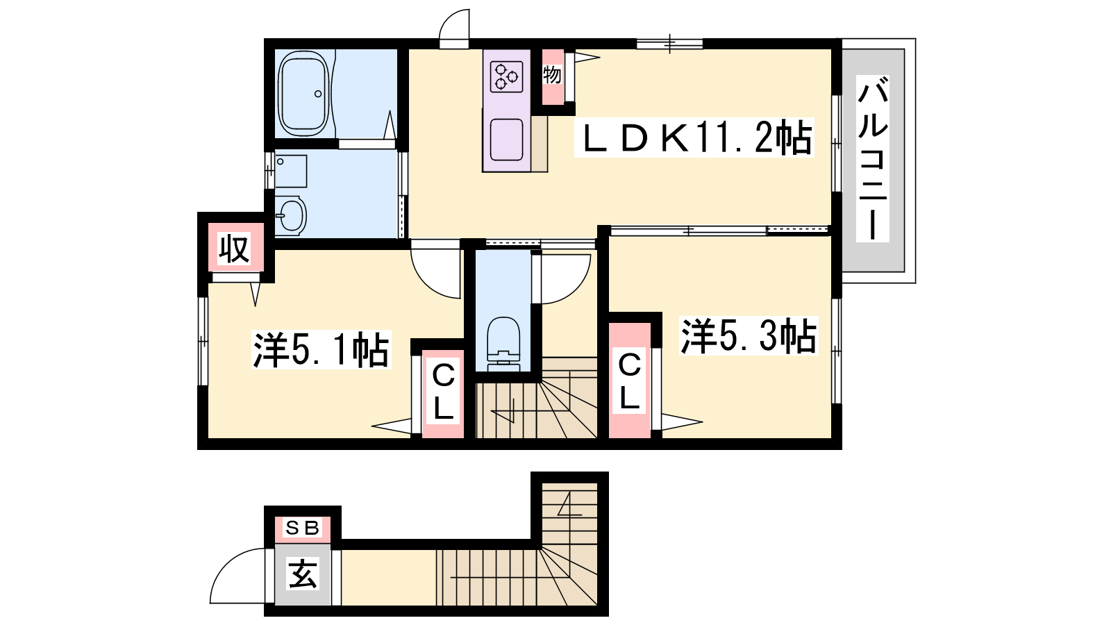 - LDK11.2帖、洋室5.3帖、洋室5.1帖