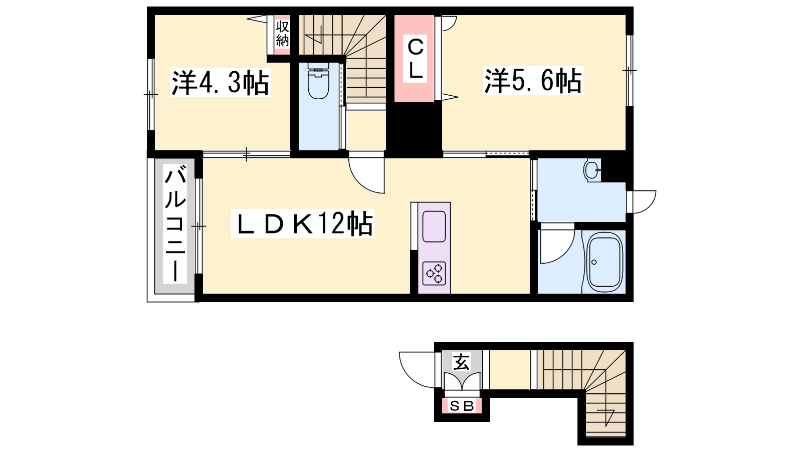 - LDK12帖、洋室5.6帖、洋室4.3帖