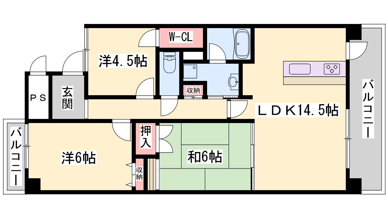 - LDK14.5帖、洋室6帖、洋室4.5帖、和室6帖