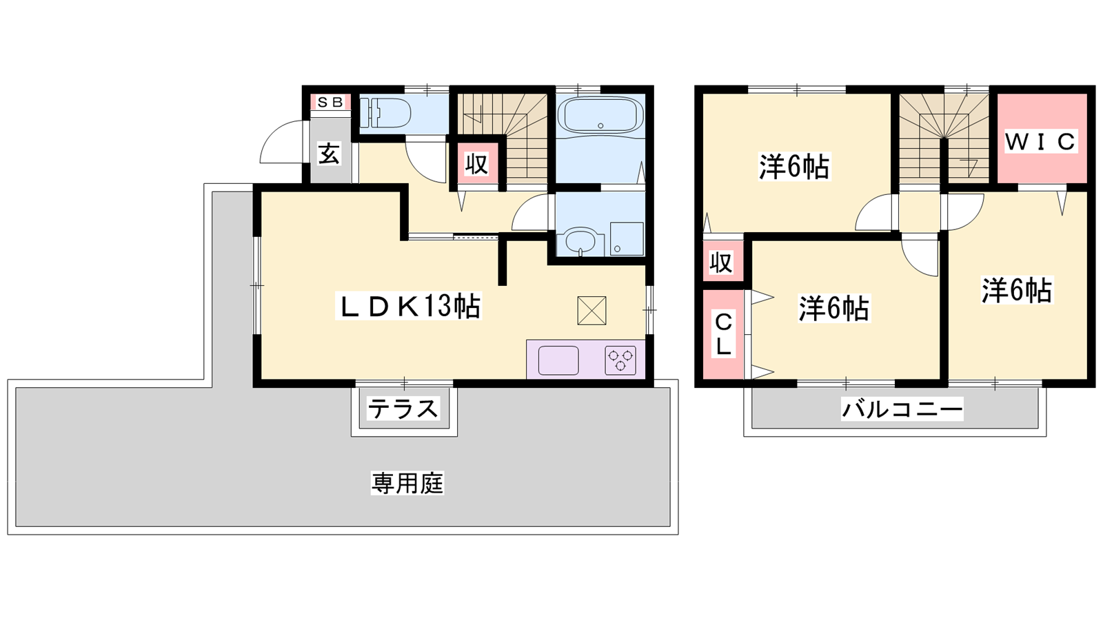 - LDK13帖、洋室6帖、洋室6帖、洋室6帖