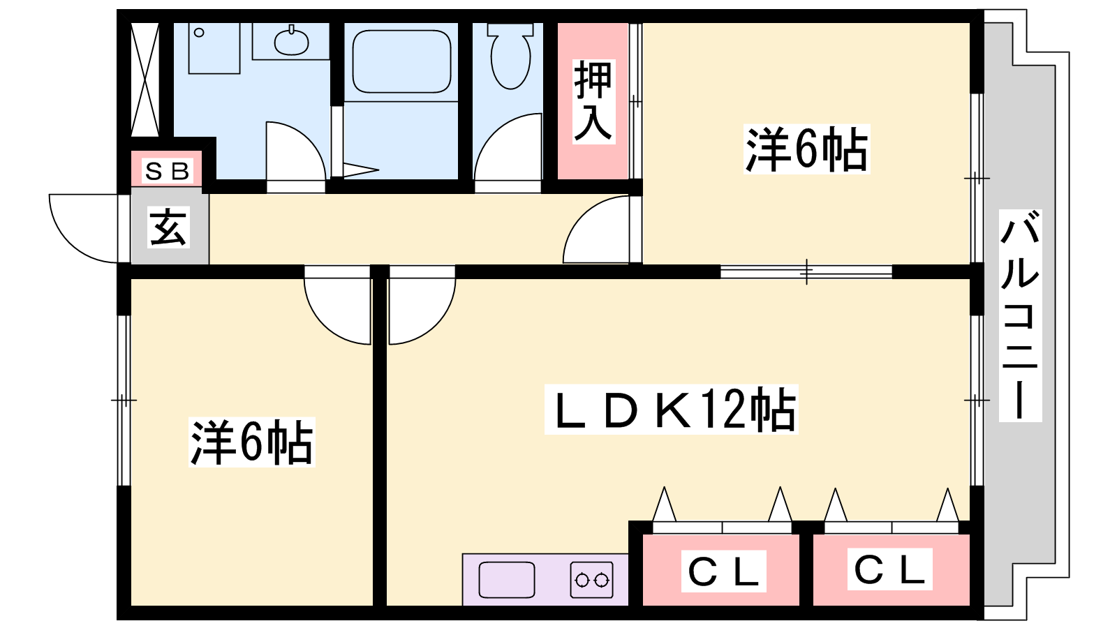 - LDK12帖、洋室6帖、洋室6帖