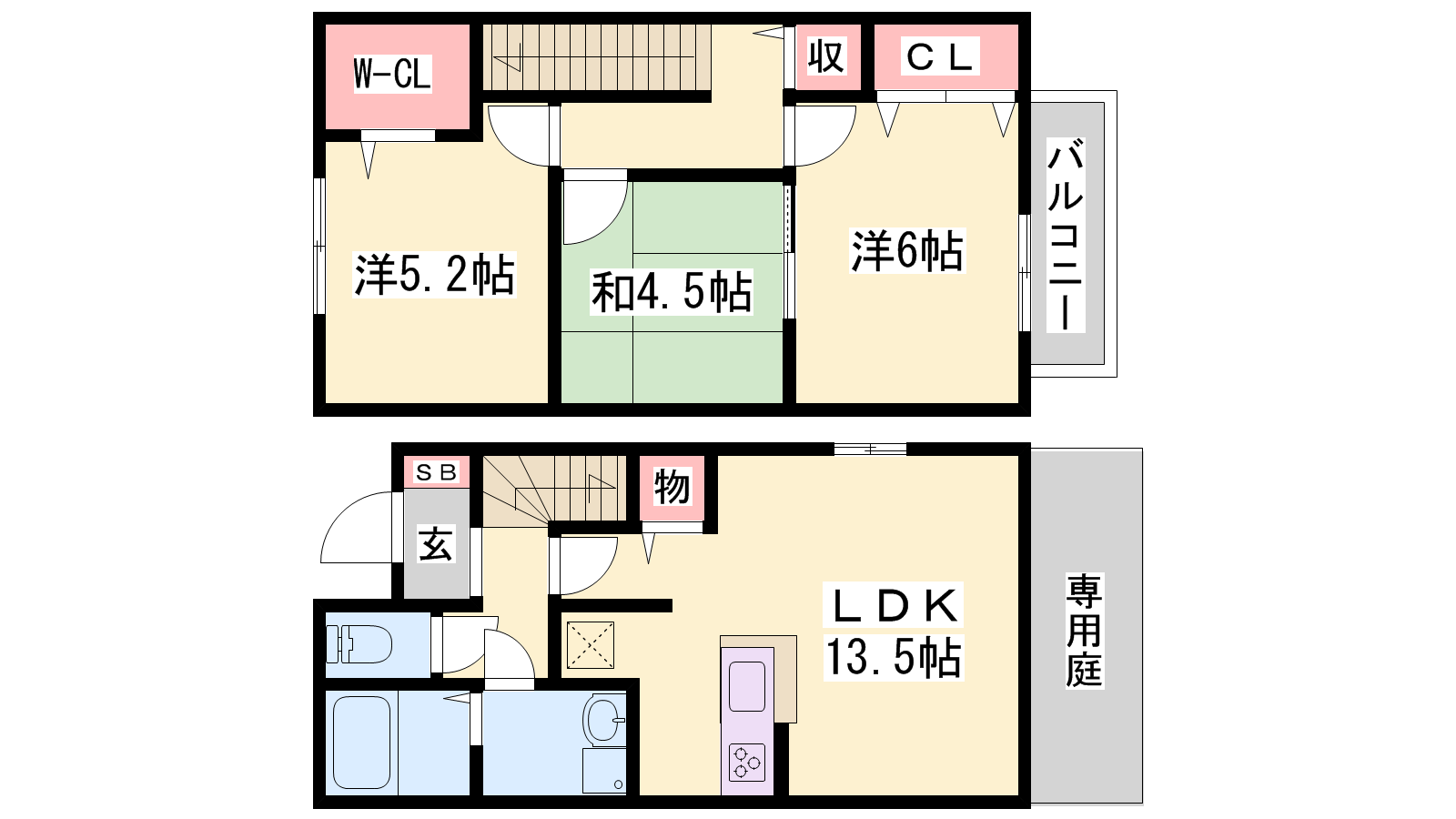 - LDK13.5帖、洋室6帖、洋室5.2帖、和室4.5帖