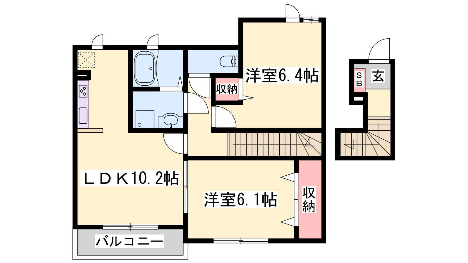 - LDK10.2帖、洋室6.4帖、洋室6.1帖