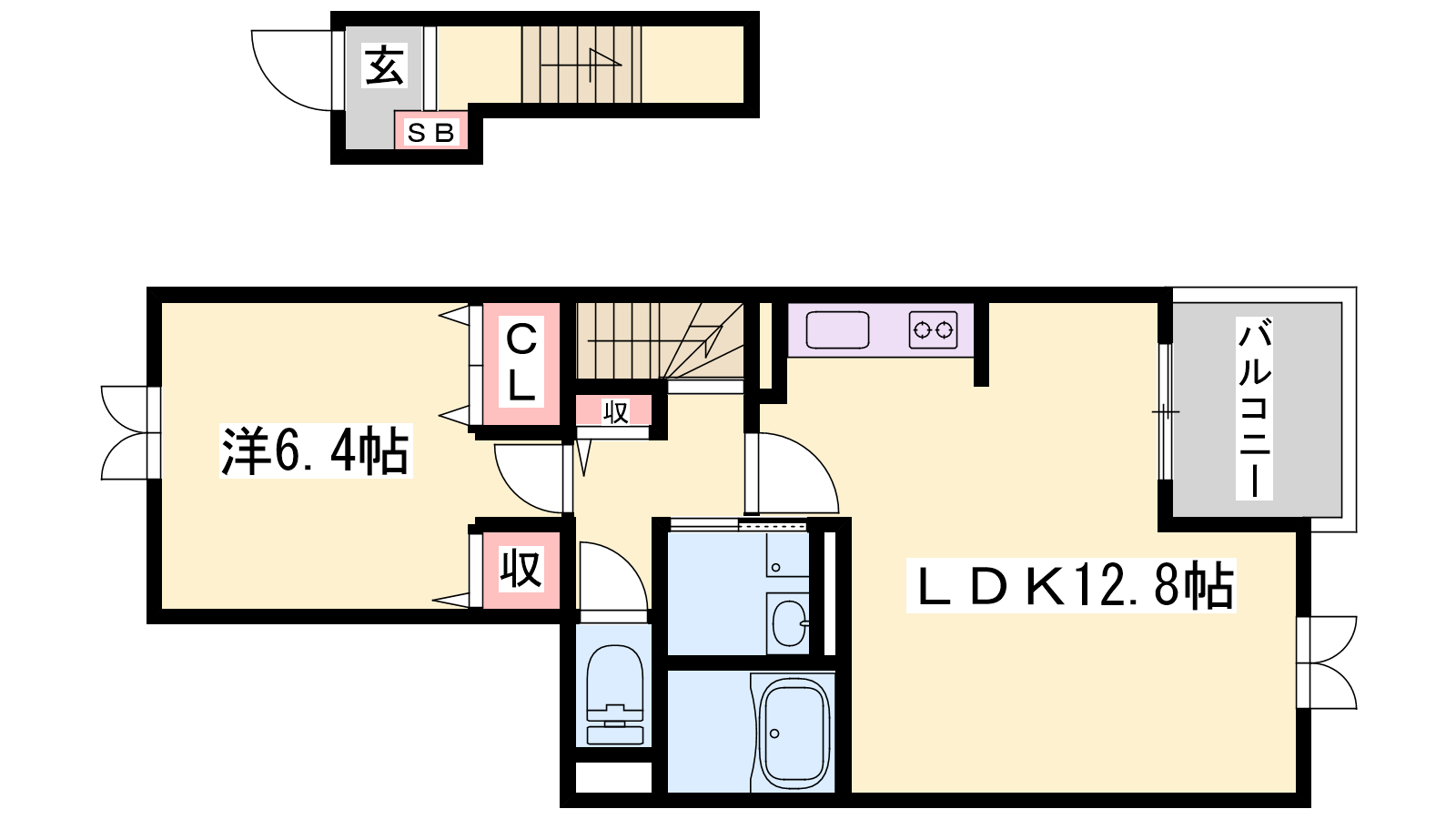 - LDK12.8帖、洋室6.4帖