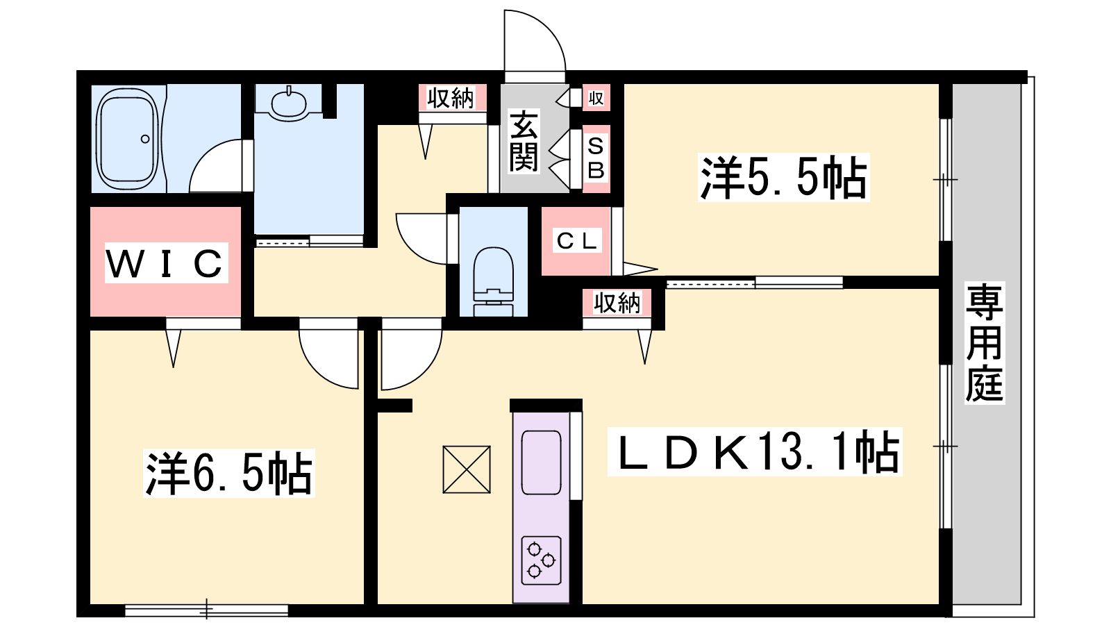 - LDK13.1帖、洋室6.5帖、洋室5.5帖