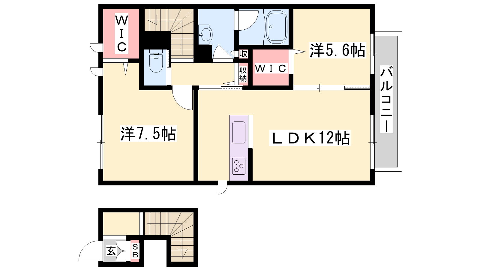 - LDK12帖、洋室7.5帖、洋室5.6帖