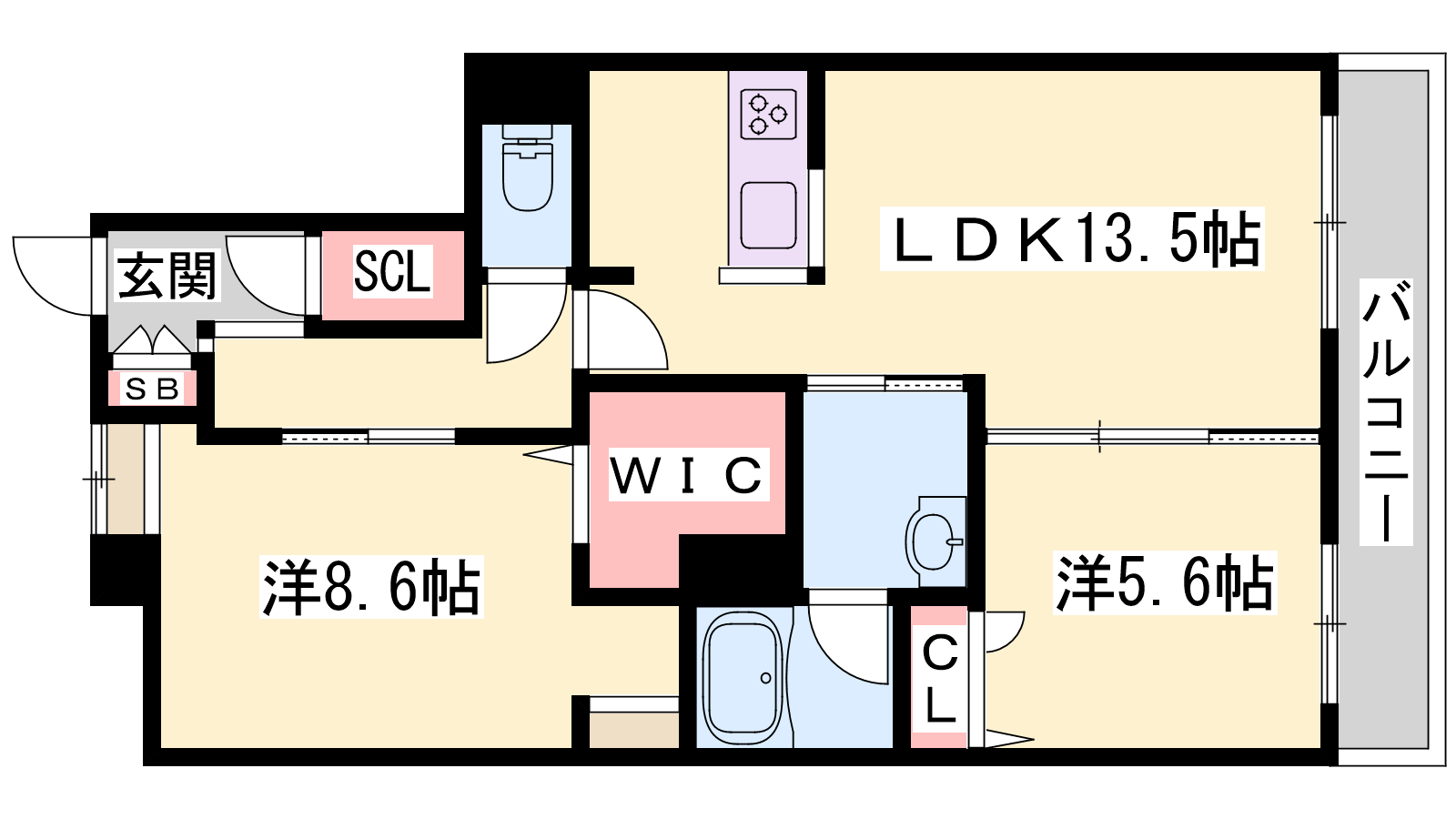 - LDK13.5帖、洋室8.6帖、洋室5.6帖