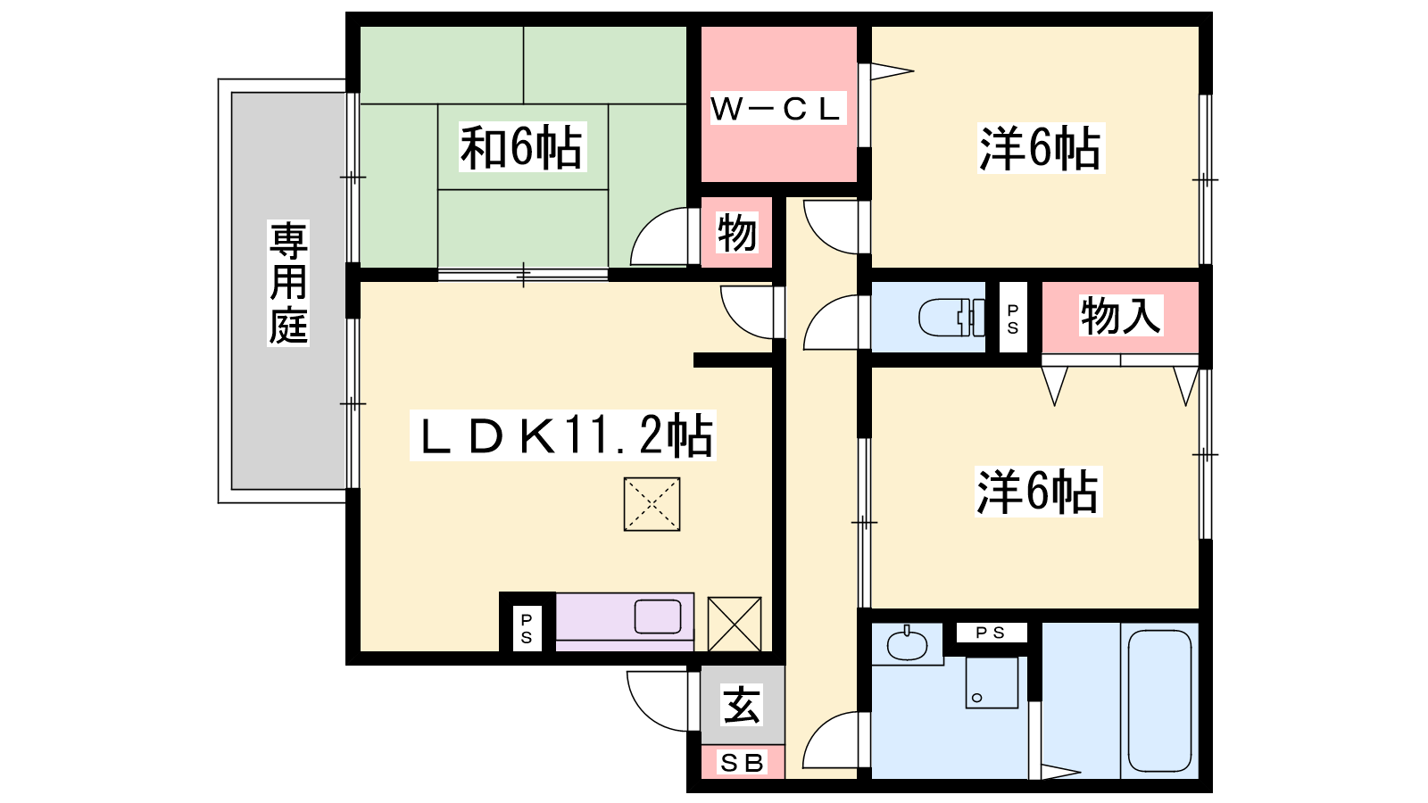 - LDK11.2帖、和室6帖、洋室6帖、洋室6帖