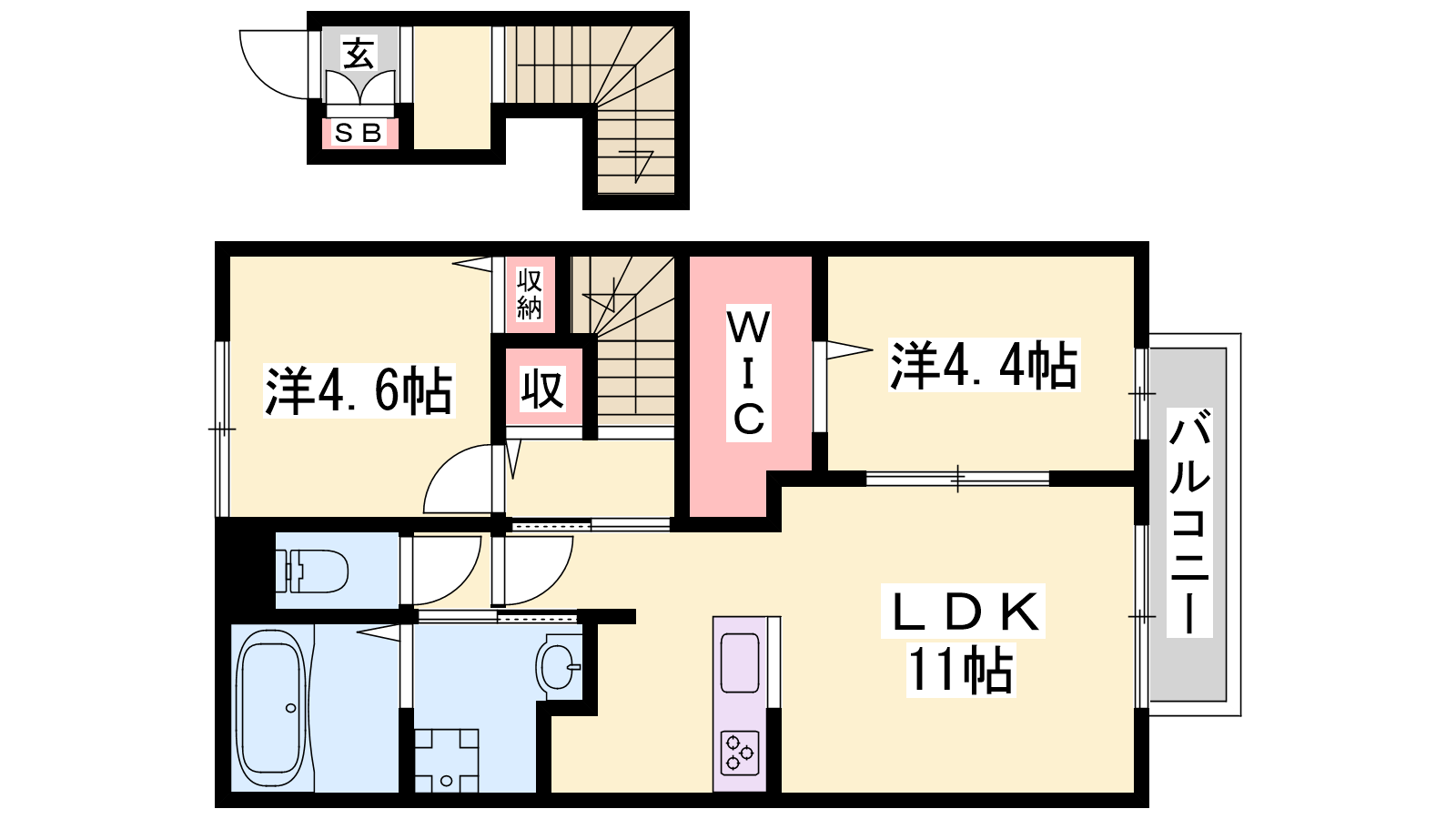 - LDK11帖、洋室4.6帖、洋室4.4帖