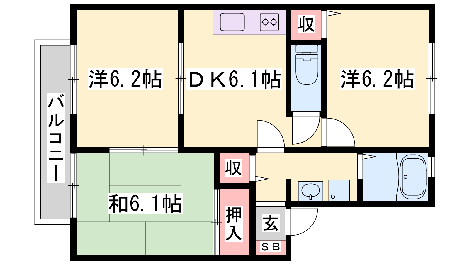 - DK6.1帖、洋室6.2帖、洋室6.2帖、和室6.1帖