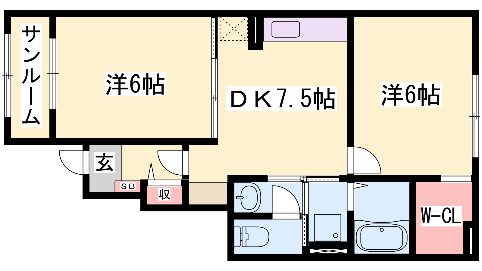 - DK7.5帖、洋室6帖、洋室6帖