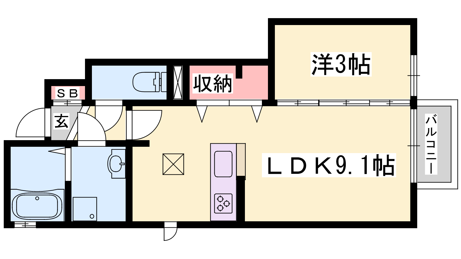 - LDK9.1帖、洋室3帖