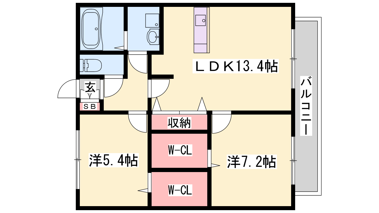 - LDK13.4帖、洋室7.2帖、洋室5.4帖