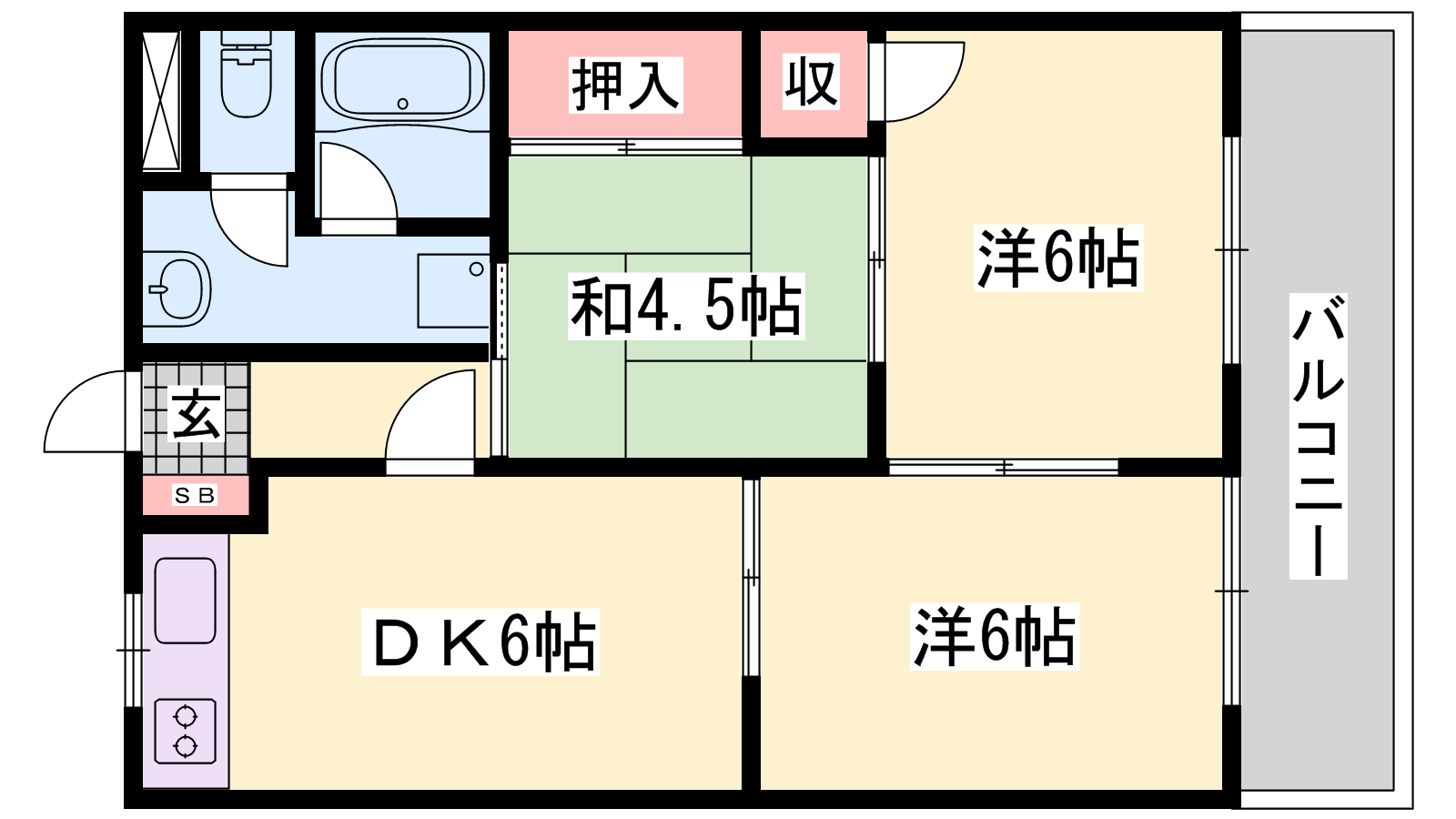 - DK6帖、洋室6帖、洋室6帖、和室4.5帖