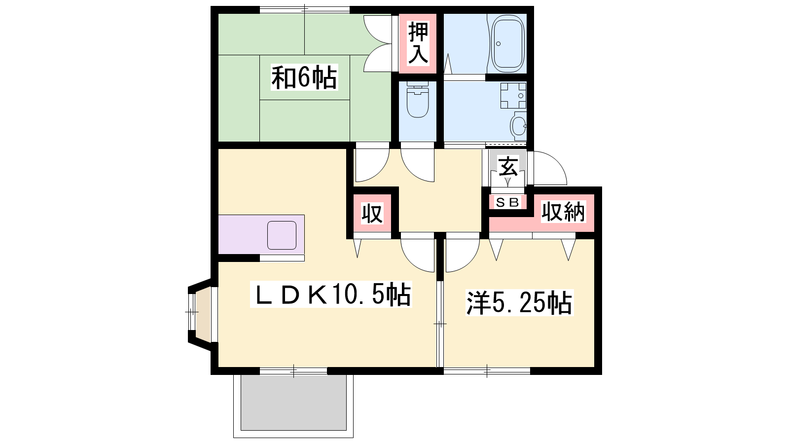 - LDK10.5帖、洋室5.25帖、和室6帖