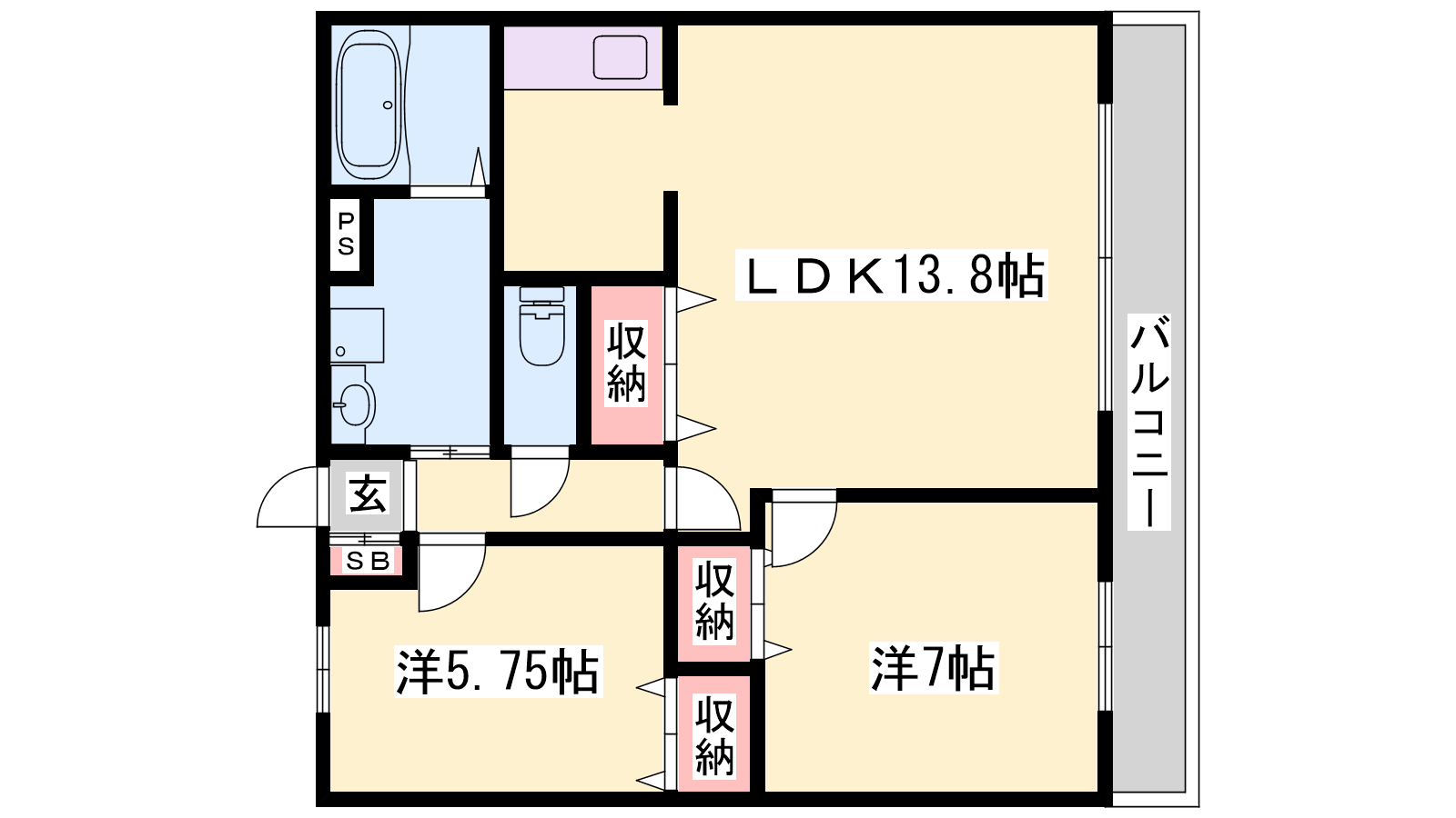 - LDK13.8帖、洋室7帖、洋室5.75帖