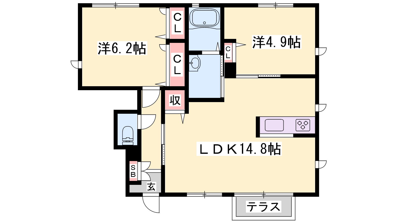 - LDK14.8帖、洋室6.2帖、洋室4.9帖