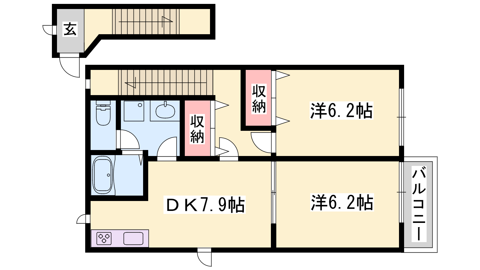 - DK7.9帖、洋室6.2帖、洋室6.2帖