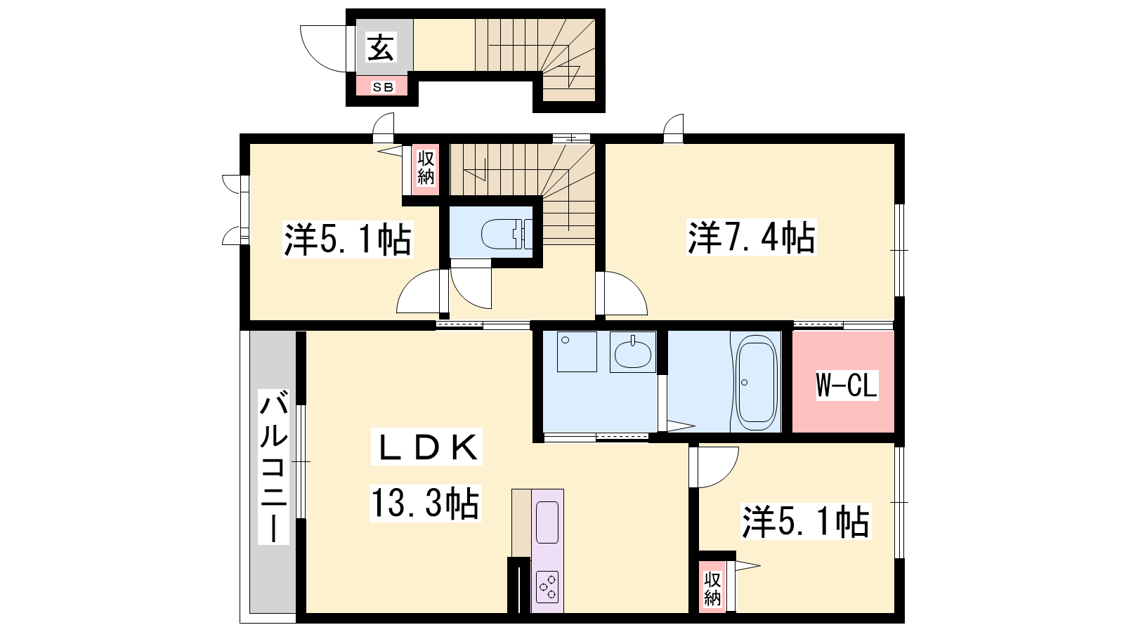 - LDK13.3帖、洋室5.1帖、洋室5.1帖、洋室7.4帖