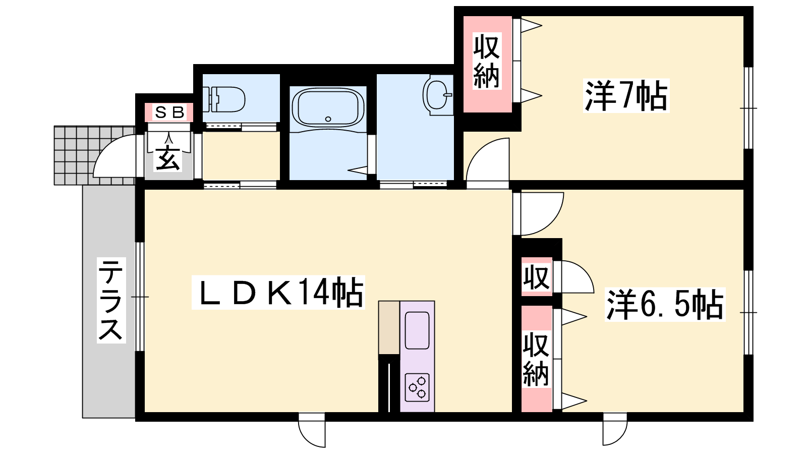 - LDK14帖、洋室7帖、洋室6.5帖