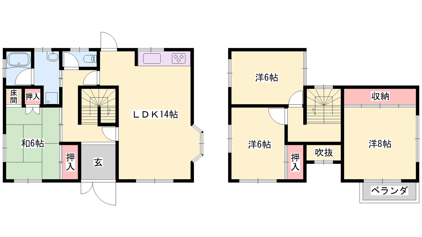 - LDK14帖、洋室8帖、洋室6帖、洋室6帖、和室6帖