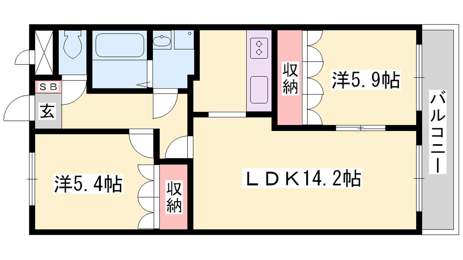 - LDK14.2帖、洋室5.9帖、洋室5.4帖