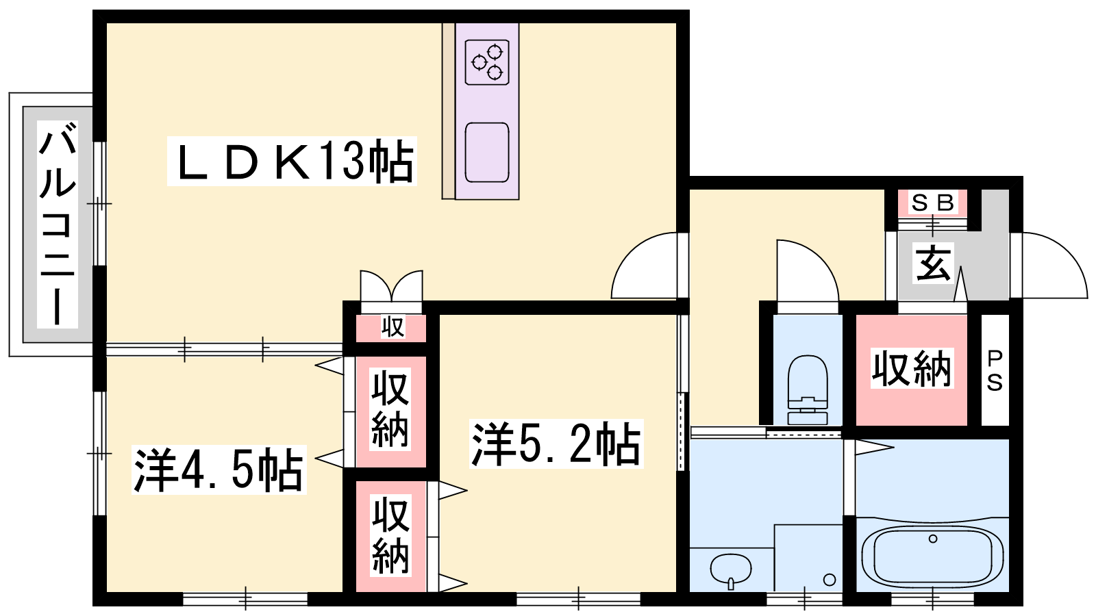 - LDK13帖、洋室5.2帖、洋室4.5帖