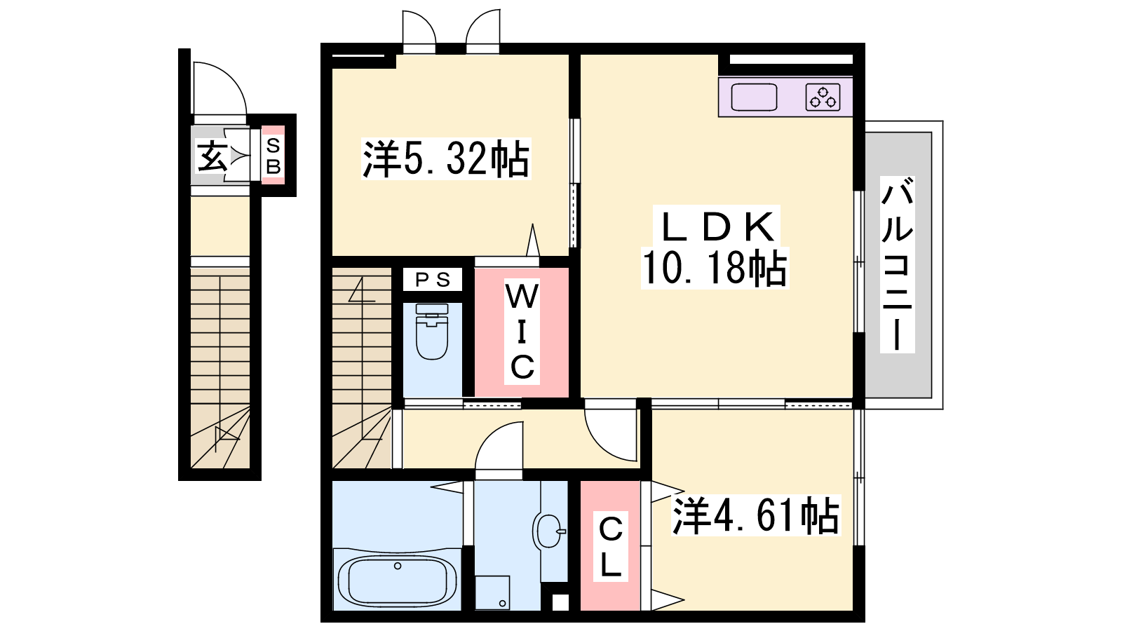 - LDK10.18帖、洋室5.32帖、洋室4.61帖