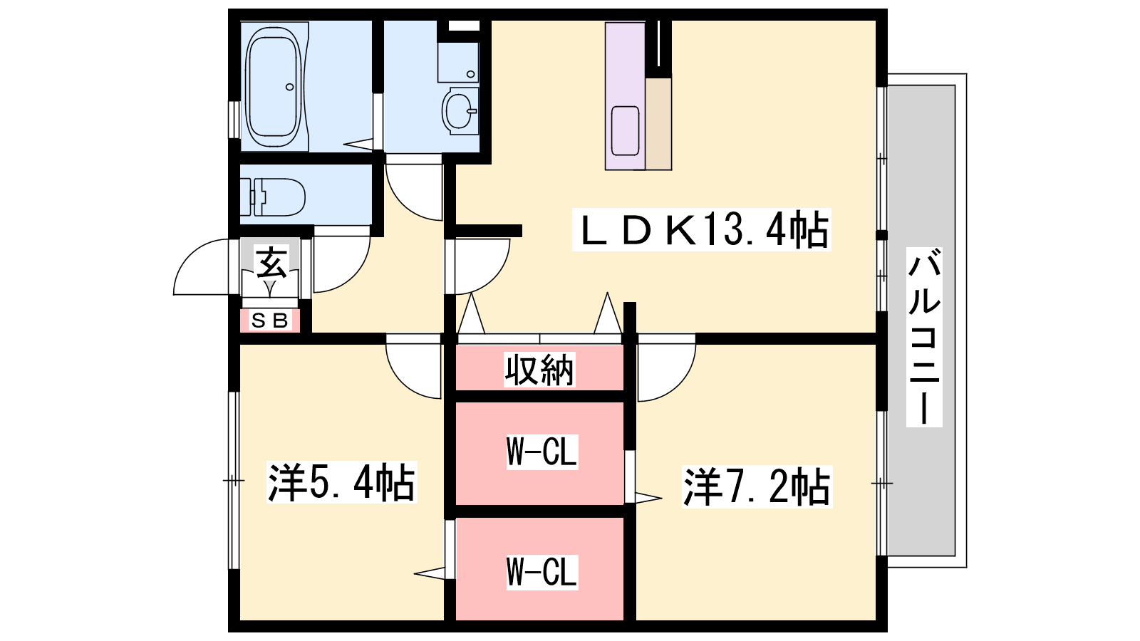 - LDK13.4帖、洋室7.2帖、洋室5.4帖