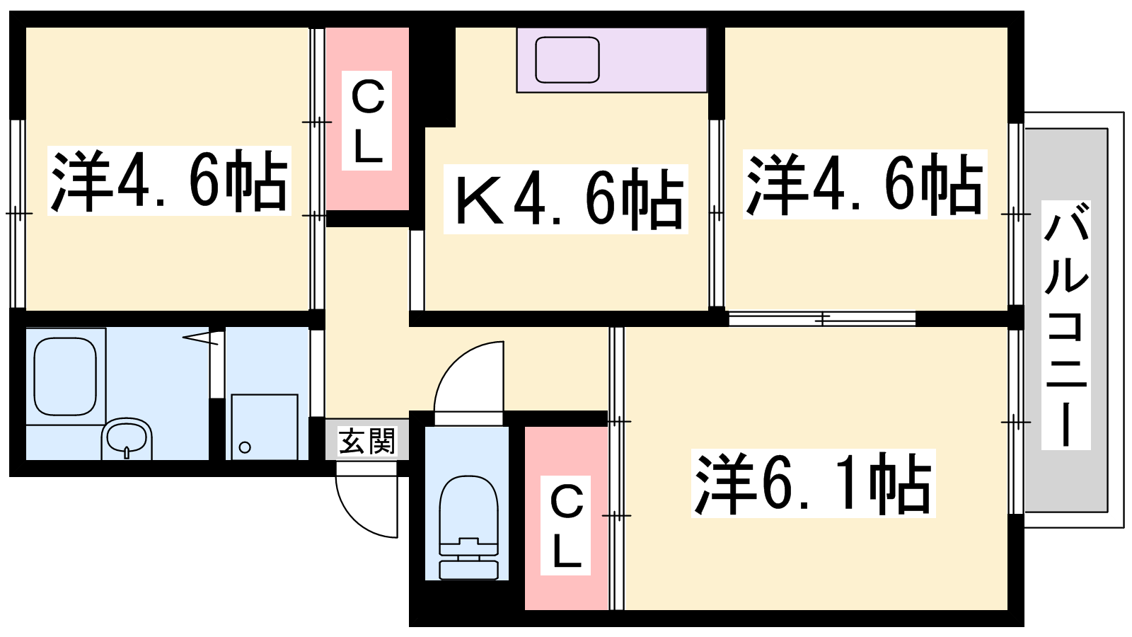- K4.6帖、洋室6.1帖、洋室4.6帖、洋室4.6帖