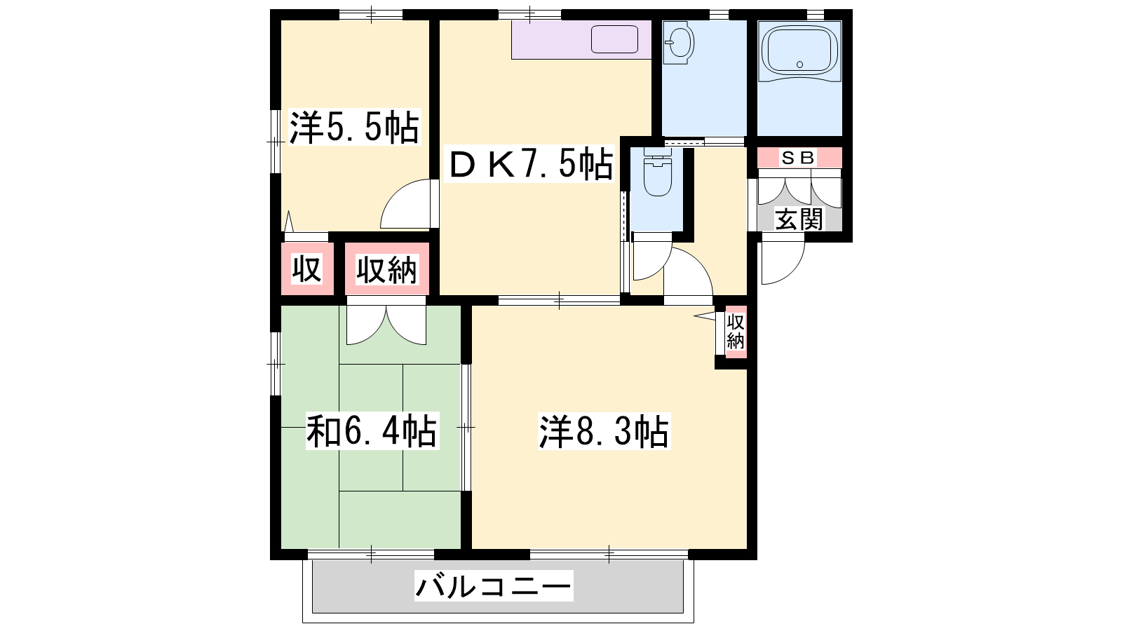 - DK7.5帖、洋室8.3帖、洋室5.5帖、和室6.4帖