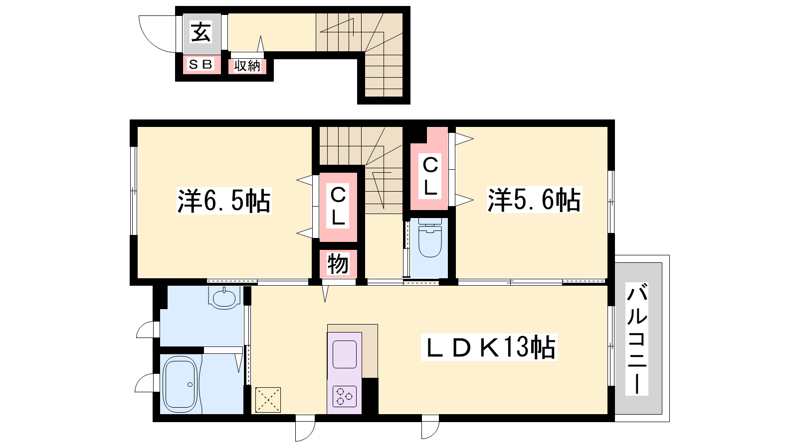 - LDK13帖、洋室6.5帖、洋室5.6帖