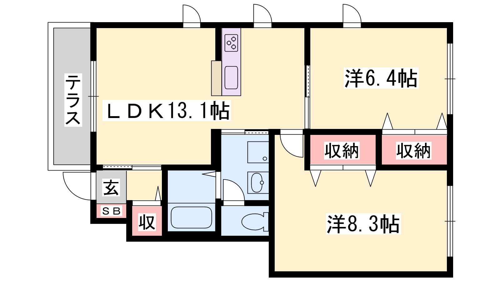 - LDK13.1帖、洋室8.3帖、洋室6.4帖