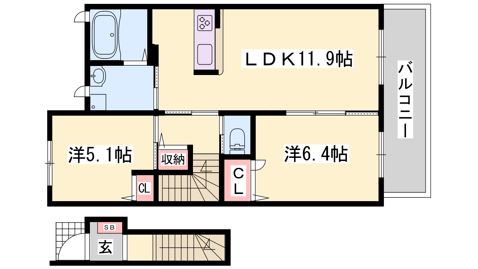- LDK11.9帖、洋室6.4帖、洋室5.1帖