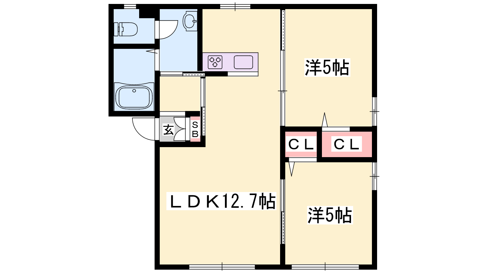 - LDK12.7帖、洋室5帖、洋室5帖
