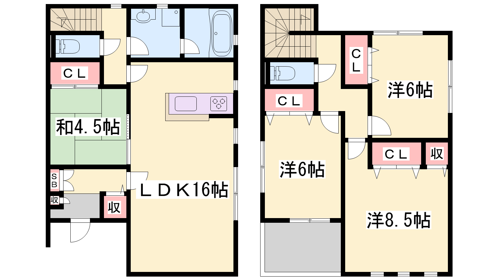 - LDK16帖、洋室8.5帖、洋室6帖、洋室6帖、和室4.5帖