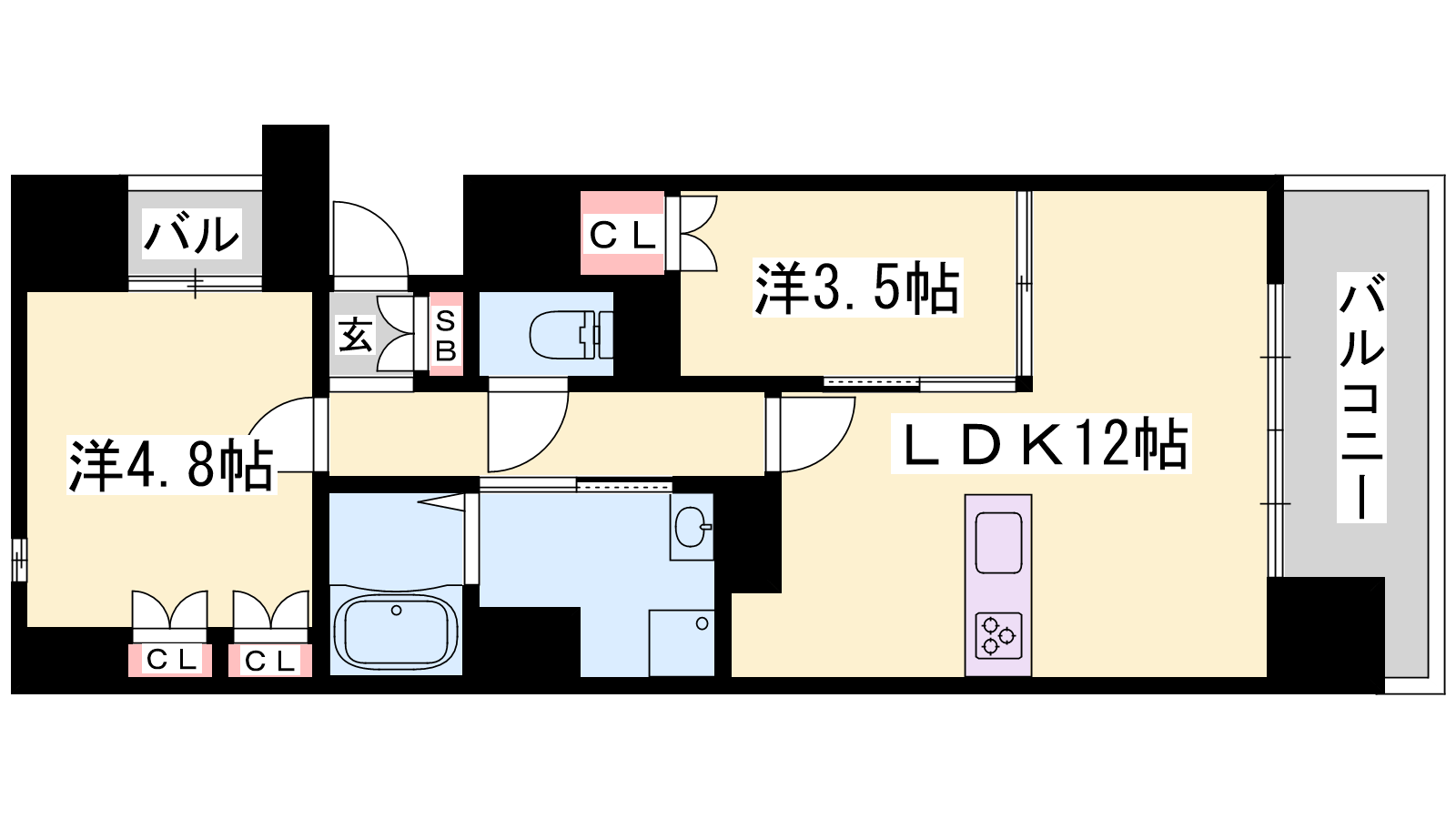 - LDK12帖、洋室4.8帖、洋室3.5帖