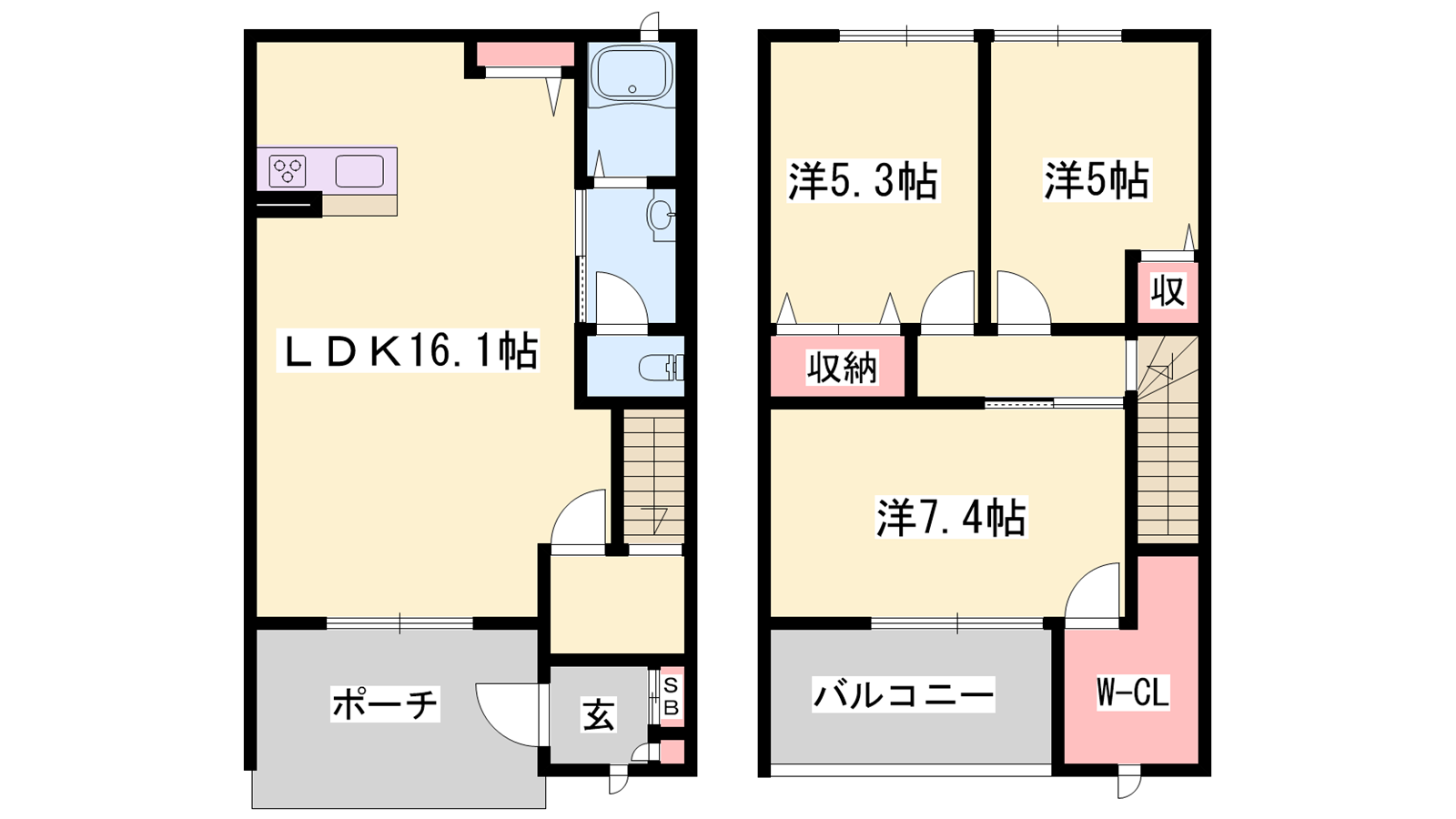 - LDK16.1帖、洋室5帖、洋室5.3帖、洋室7.4帖