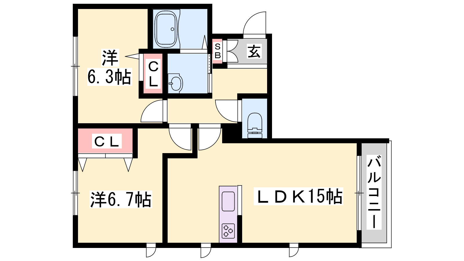 - LDK15帖、洋室6.7帖、洋室6.3帖