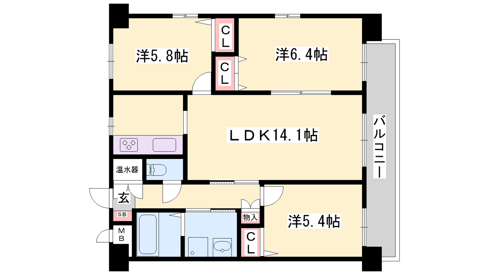 - LDK14.1帖、洋室6.4帖、洋室5.8帖、洋室5.4帖