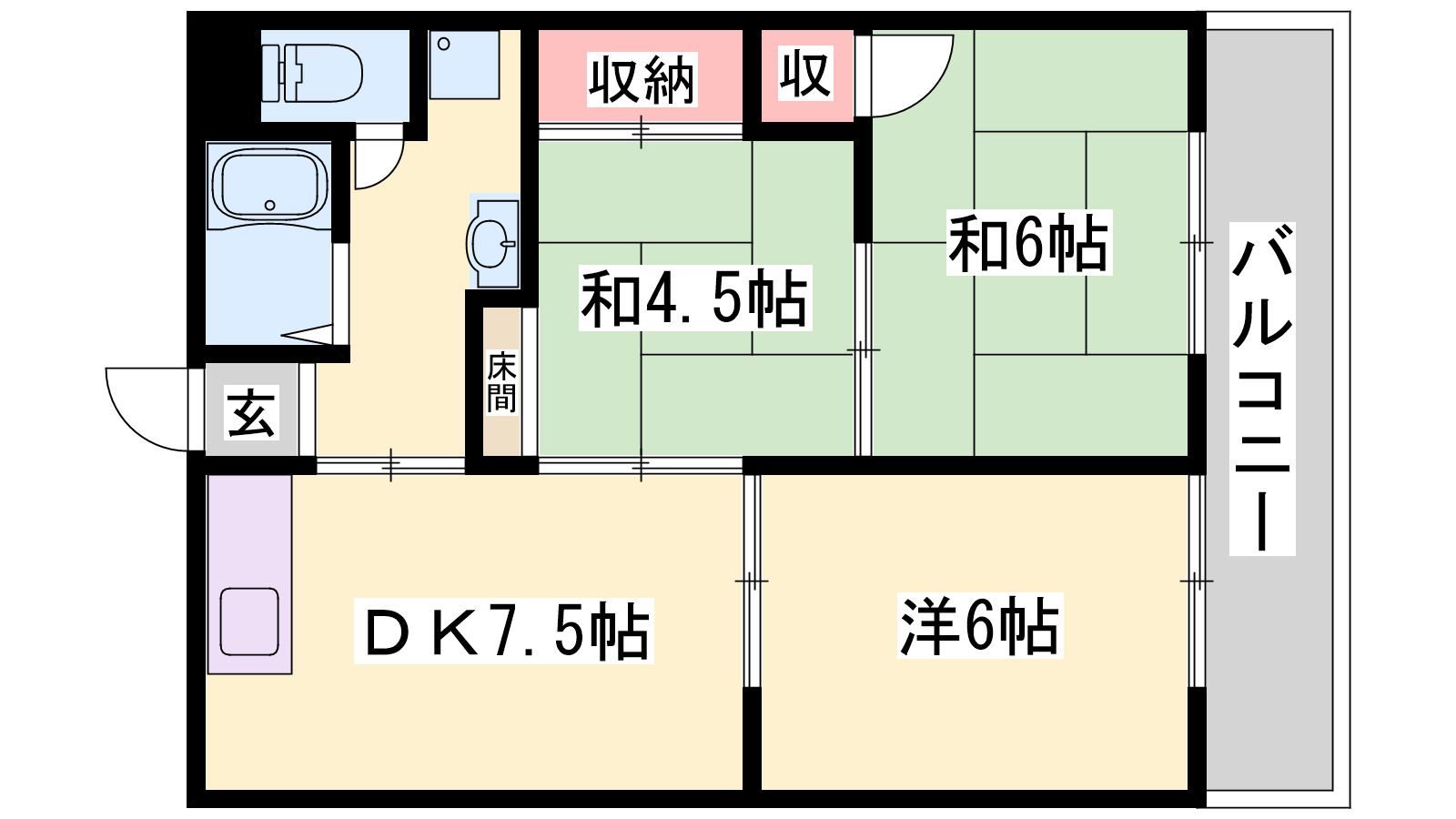 - DK7.5帖、洋室6帖、和室6帖、和室4.5帖