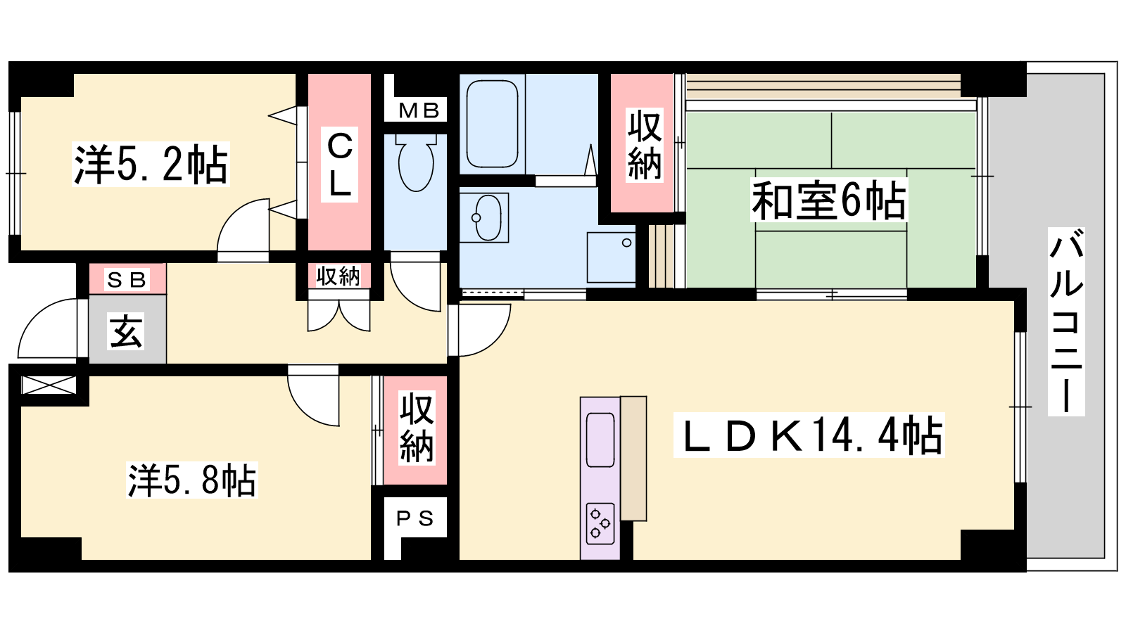 - LDK14.4帖、洋室5.8帖、洋室5.2帖、和室6帖