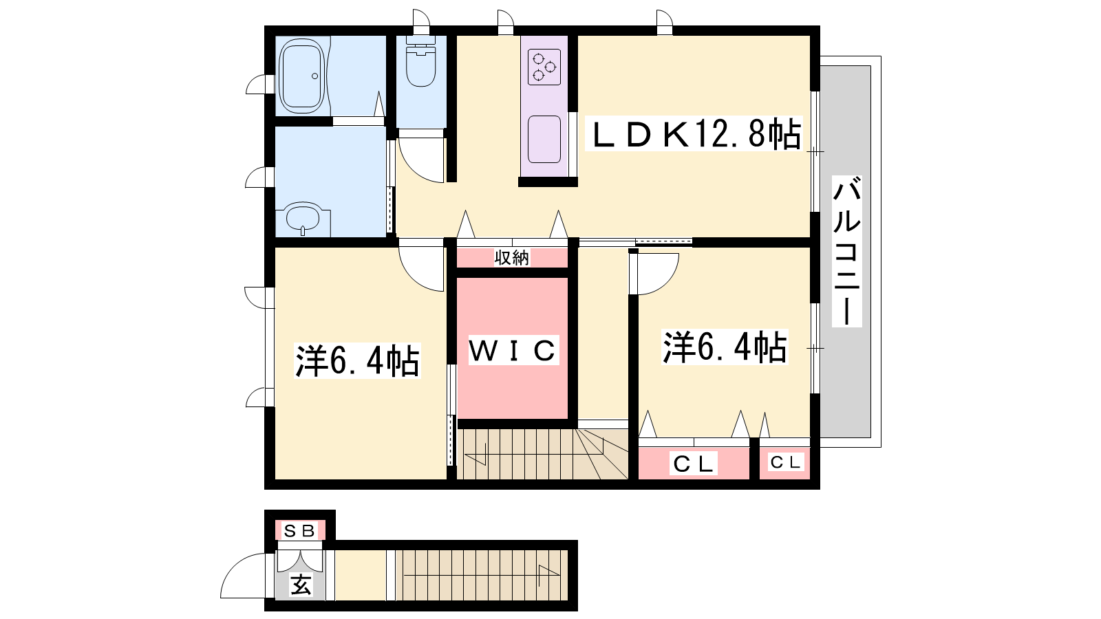 - LDK12.8帖、洋室6.4帖、洋室6.4帖