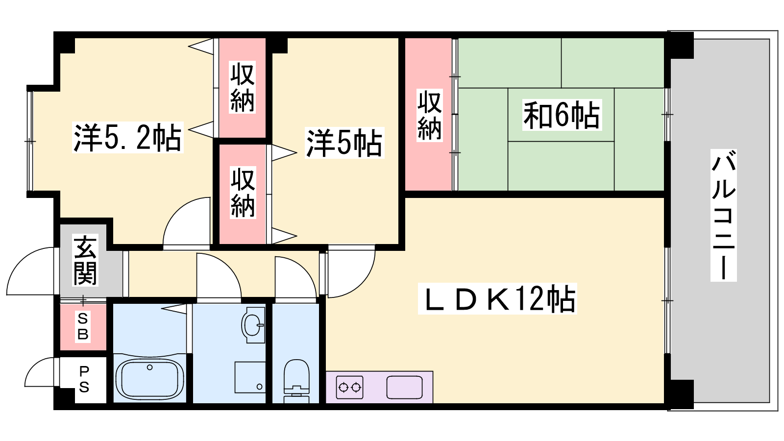 - LDK12帖、和室6帖、洋室5.2帖、洋室5帖