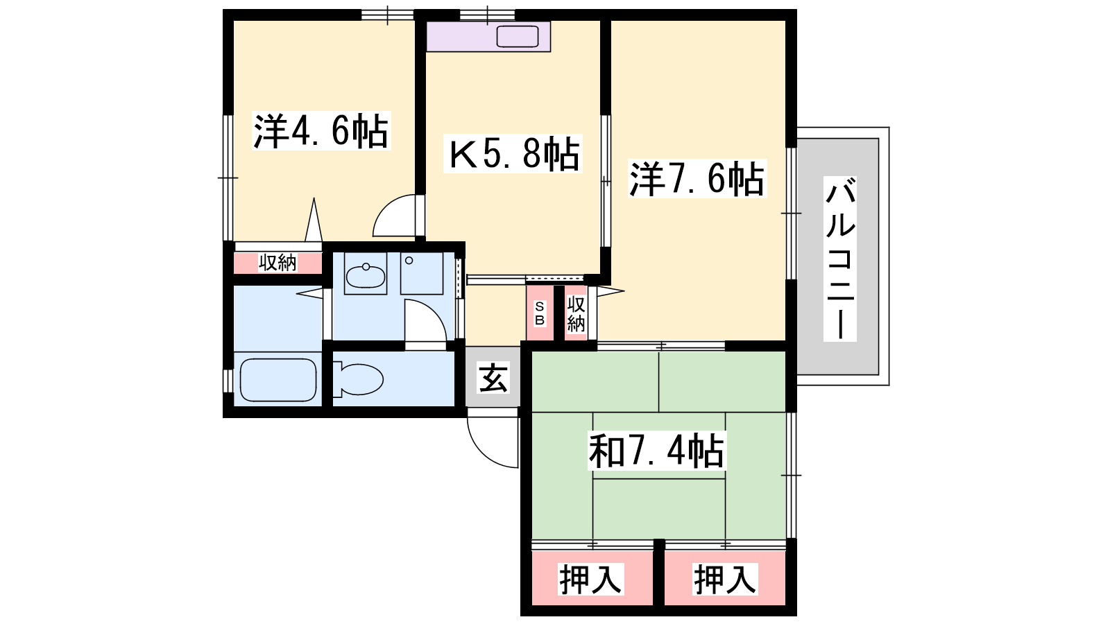 - K5.8帖、洋室7.6帖、和室7.4帖、洋室4.6帖
