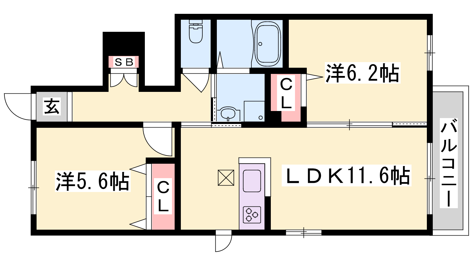 - LDK11.6帖、洋室6.2帖、洋室5.6帖