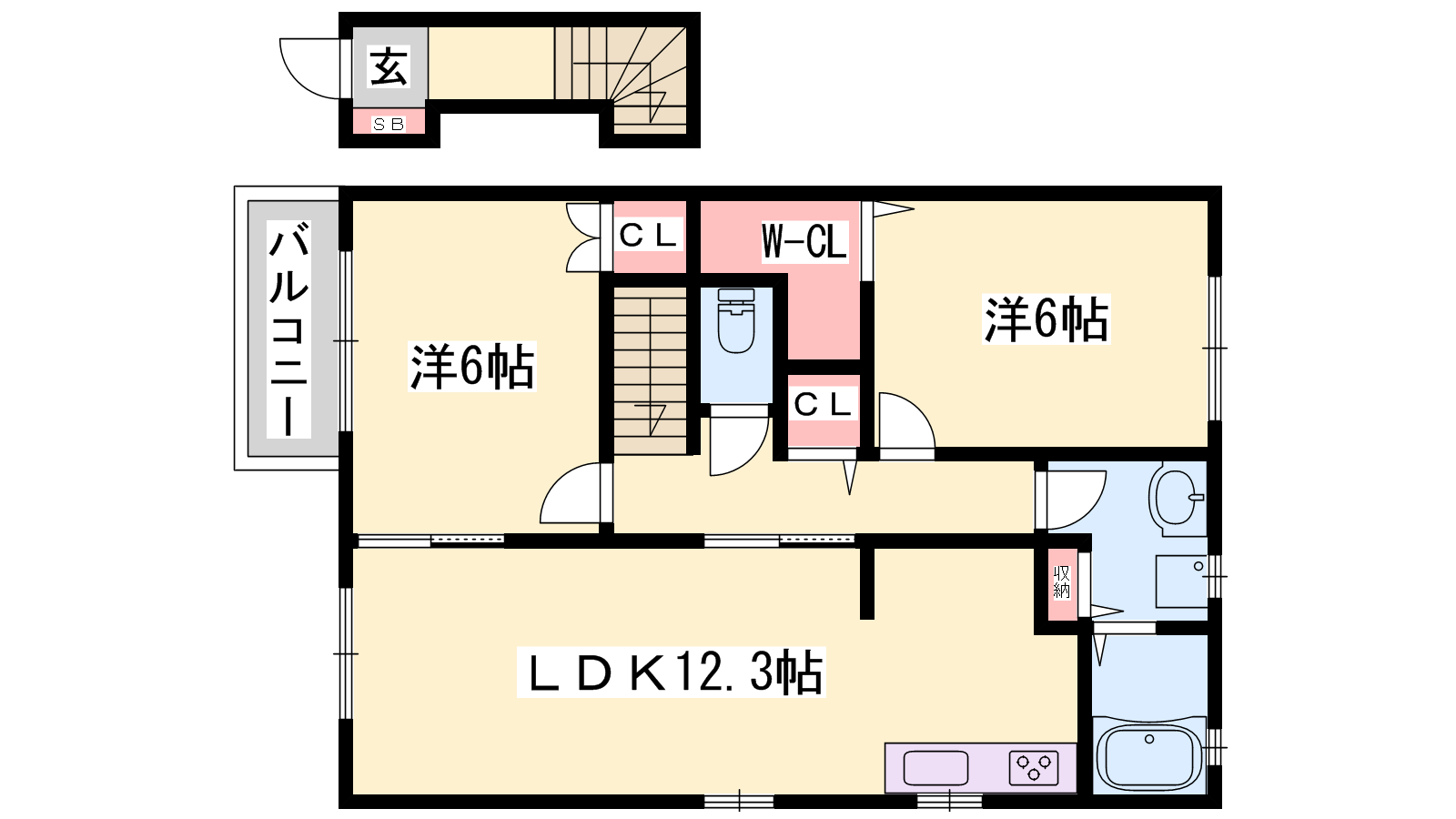 - LDK12.3帖、洋室6帖、洋室6帖