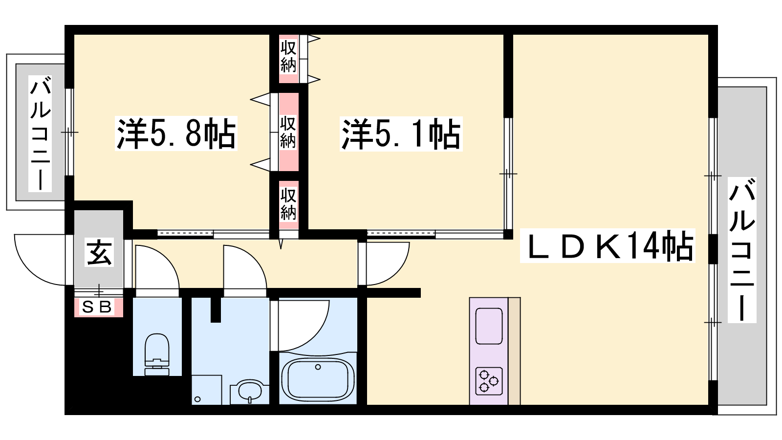 - LDK14帖、洋室5.8帖、洋室5.1帖