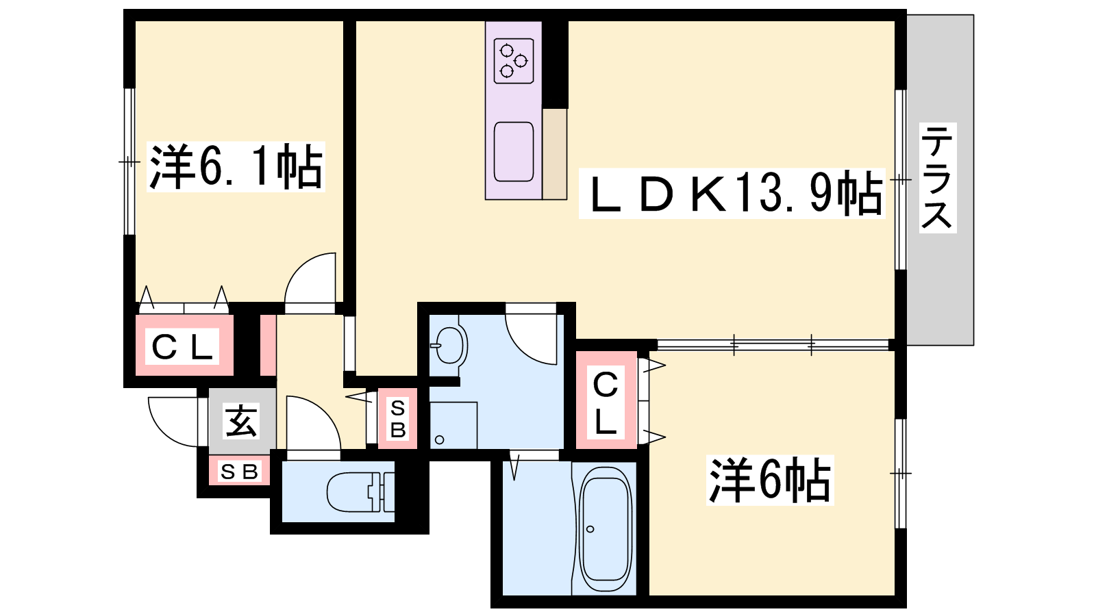 - LDK13.9帖、洋室6.1帖、洋室6帖