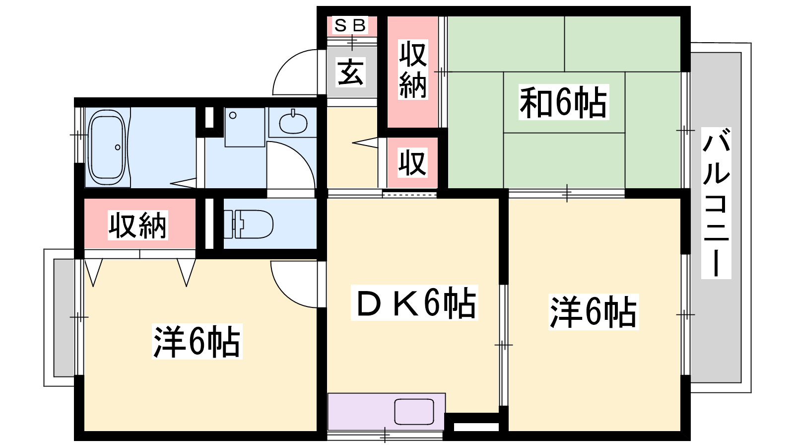 - DK6帖、洋室6帖、洋室6帖、和室6帖